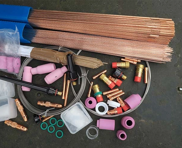 Welding rods, cutting tools, lubricants, fasteners, and bolts for daily operations.