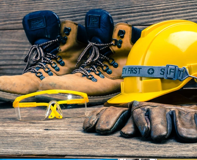Helmets, gloves, harnesses, reflective jackets, and safety shoes for workforce protection.