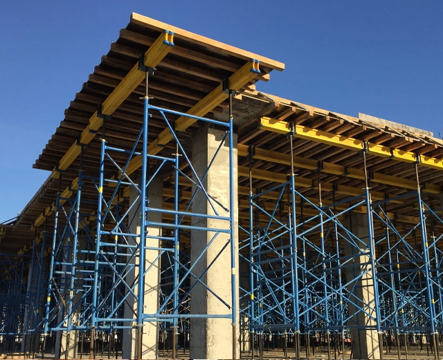 Steel scaffolding, durable boards, couplers, and shuttering materials for safe, flexible access.